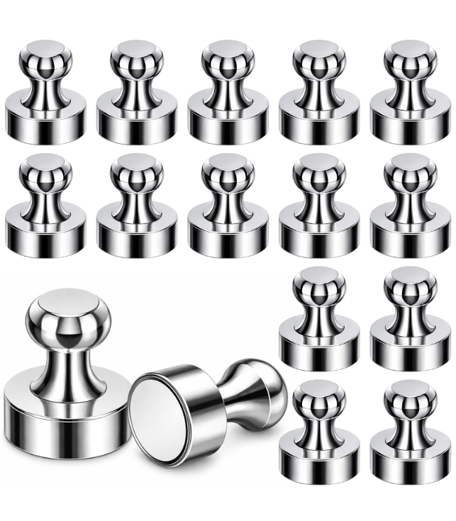 ➡️ Magnesy neodymowe w zestawie 16 sztuk to praktyczne i wyjątkowo mocne pinezki do codziennego użytku. Dzięki silnej przyczepności bez problemu utrzymują kartki, notatki czy zdjęcia na tablicy magnetycznej lub lodówce. Kompaktowy rozmiar i elegancki, srebrny kolor sprawiają, że są dyskretne. Trwałe wykonanie gwarantuje długą żywotność i niezawodne działanie w domu, biurze lub szkole.